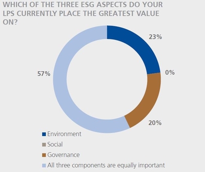 The question as to which ESG aspect is currently rated most important by LPs also failed to yield a clear answer: 23 per cent say: environmental, 20 per cent say: governance, whilst nobody said: social. The majority (that is, 57 per cent) do not see a difference, indicating that their LPs attach the same level of importance to all three ESG criteria.