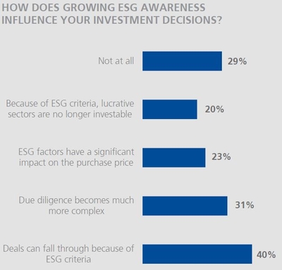 At first glance, the ESG trend is limiting financial investors’ room for manoeuvre: 40 per cent of respondents stated that transactions could fall through due to negative ESG findings, and 31 per cent believe that due diligence processes have become significantly more complex as a result of ESG. Every fifth investor furthermore complains that intrinsically lucrative sectors are no longer investable due to ESG criteria. However, about 30 per cent also think that the increasing ESG awareness does not affect investment decisions at all.