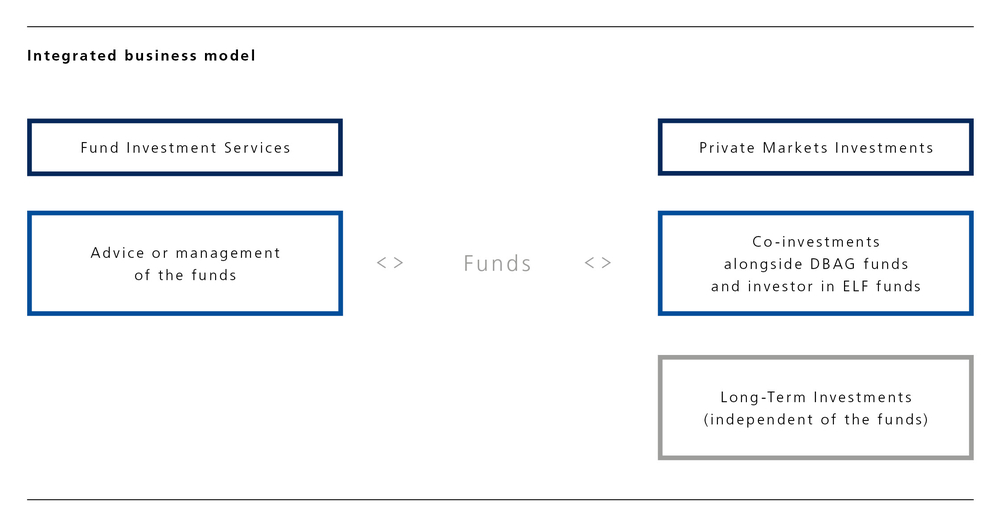 DBAG’s business model, which is geared towards increasing value for its shareholders, rests on two pillars – Fund Investment Services and Private Markets Investments. The Funds provide a strong link between the two segments. Because the Funds are at the core of our business model, we refer to it as being integrated.