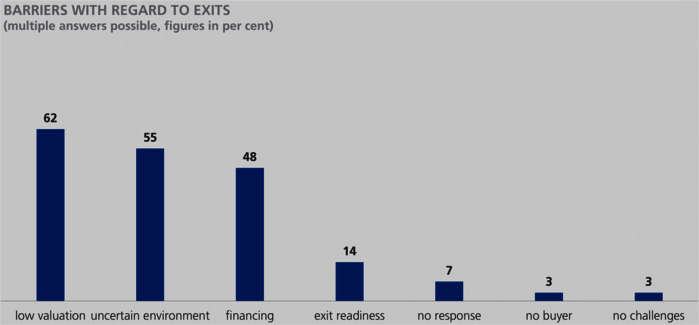 According to the study participants, the biggest challenges in a context of disposals are mixed. Thus, by multiple responses, 62 per cent stated that valuations were too low, 55 per cent felt that the market environment was too uncertain, and 48 per cent complained about access to financing. Only three percent of investment managers surveyed said there are "no buyers." Of the disposals that could be realised, 55 per cent went to strategists, and only 17 per cent went to a financial investor as part of a secondary.