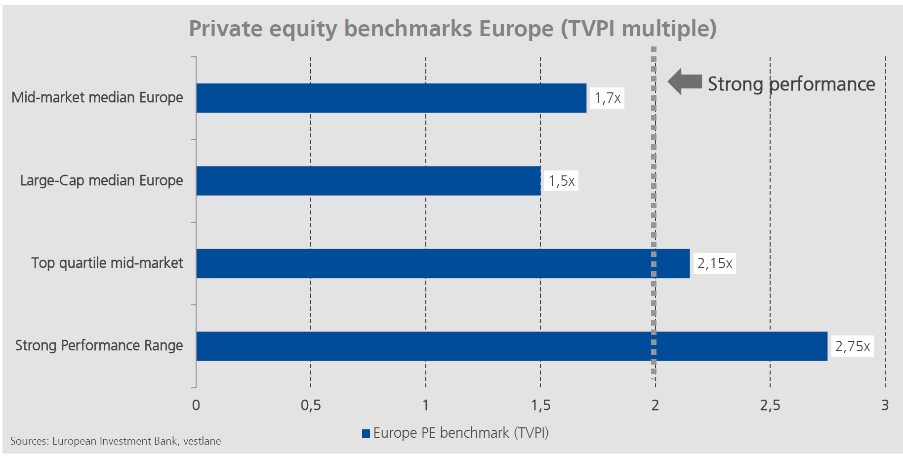 The European mid-market buyout segment spearheads private equity benchmarks in Europe, with top-quartile funds achieving a multiple of 2.15x.