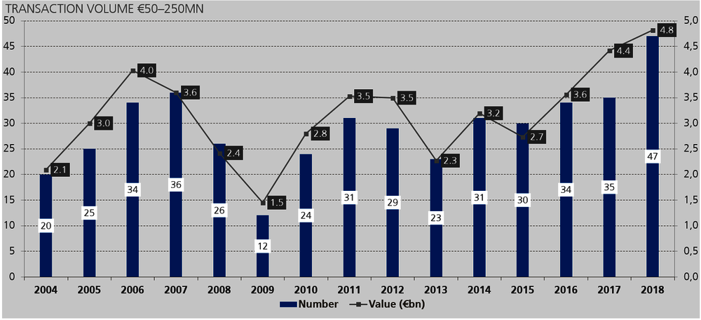 Last year, private equity firms financed buyouts in the German mid-market segment worth a good 4.8 billion euros. This is the highest value seen since 2002; in 2017, the market volume came to 4.4 billion euros. The average company value, however, dropped from 126 million euros to 103 million euros. Unlike in 2017, the vast majority of transactions (30 out of 47) in 2018 related to the lower portion of the segment (company values of 50 million euros to 100 million euros). This is in line with the large proportion of company founders among the sellers: out of the 19 MBOs that saw financial investors replace families as shareholders, 13 disposals were made by the company’s founder. As in the previous year, around half of the transactions (24 out of 47) were structured by multinational, pan-European private equity funds.