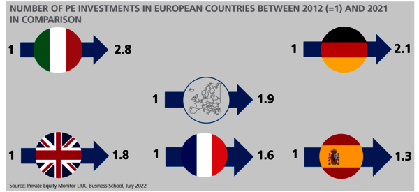 Hence, in 2021, a trend continued that was already observable over the previous decade. Compared to other sizeable PE markets, the Italian private equity market remained particularly robust, as illustrated by an analysis of the Italian LIUC Business School. According to their data, the number of new investments by financial investors in five European countries increased by a total of 90 per cent between 2012 and 2021, with these five countries accounting for around 70 per cent of all PE investments in Europe. Great Britain, France and Spain saw less than 1.9 times the number of investments, exceeding the 2012 figure by only 1.8x (Great Britain), 1.6x (France) or even just 1.3x (Spain) in 2021. At 2.1x, Germany exceeded the European average. But Italy, where the number of PE investments exceeded the level seen in 2012 by 2.8 times, came in with by far the strongest growth.