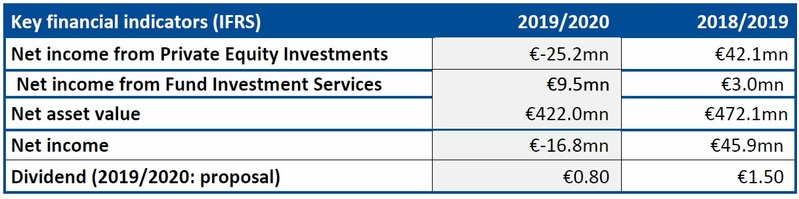 Because of the particularities of its private equity business, DBAG does not manage its business using traditional annual indicators such as EBIT or return on revenues. Instead, the key performance indicators are the parameters that DBAG can influence, and which determine the value of the two business segments, Private Equity Investments and Fund Investment Services – the net asset value of Private Equity Investments, and net income from Fund Investment Services. Accordingly, net income at Group level is not a key performance indicator; it stands at -16.8 million euros and was driven by the performance of the Private Equity Investments segment. This segment closed the financial year 2019/2020 with earnings before tax of -25.2 million euros, down by 67.3 million euros on the previous financial year.