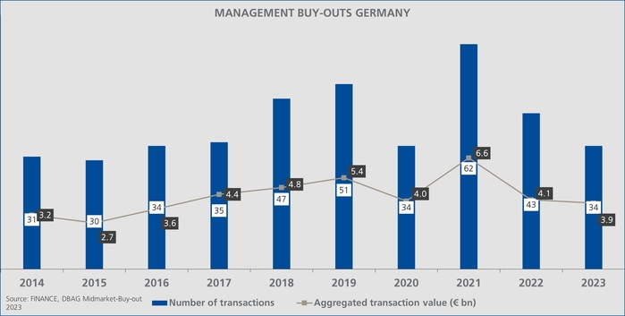 Succession arrangements are one of DBAG's special areas of expertise, for which DBAG enjoys an excellent reputation thanks to its close ties to SMEs in the Germany, Austria and Switzerland (“DACH”) region and in Northern Italy. Reflecting this, of the eight succession transactions that took place in the SME MBO market in 2023 (compared to seven in 2022), DBAG accounted for half.