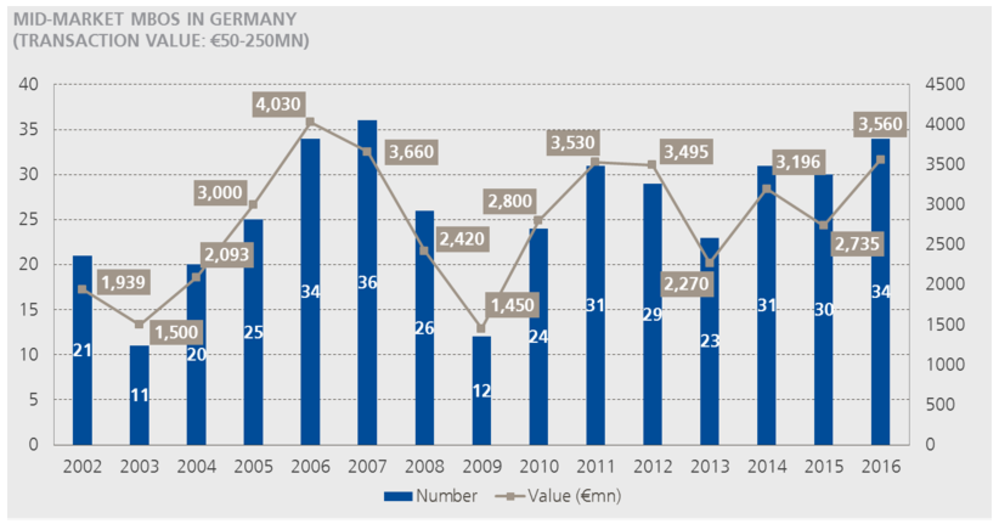 Irrespective of this assessment, financial investors structured more buyouts in Germany’s “Mittelstand” in 2016 than they had since record year 2007. Half of the transactions – 17 out of a total of 34 – related to sectors in which the price trend has been less dynamic recently. Every fifth transaction (seven of 34) involved an automotive supplier. Compared to the preceding year, the proportion of industrial companies among mid-market buyouts declined: in 2015, they accounted for approximately half of the 30 transactions, and in 2016 for only about a third.