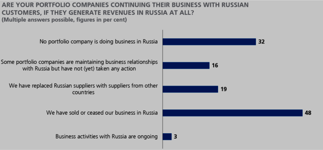 A reason why private equity investors hold on to their Russian business activities despite all could be that their share of the overall portfolio is insignificant – and that selling these activities would be too much of an effort. It also shows, however, that for investors in private equity funds it is not (yet) overly important whether revenues generated by the portfolio companies are not realised in Russia or together with Russian business partners.