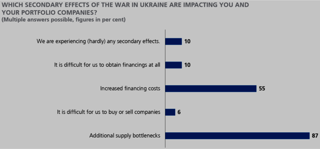 While the question on how to deal with business in Russia has been answered by many financial investors, the war’s secondary effects are now moving into focus. And investment managers have to fight on several fronts, with additional supply bottlenecks being the most serious issue. 87 per cent of the surveyed private equity managers are facing supply chain problems.